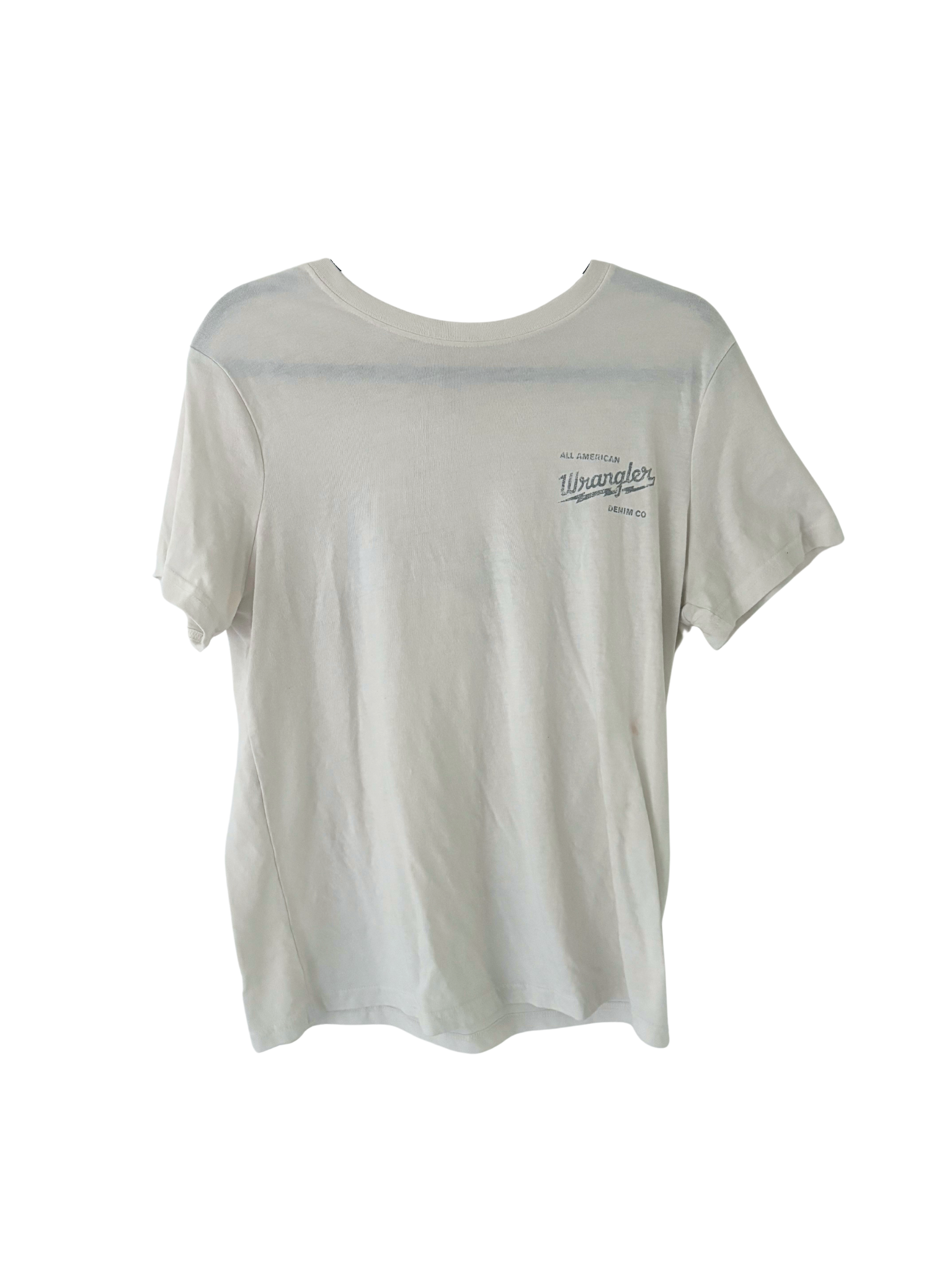 The All American Wrangler Tee is a fun and fresh white t-shirt made from breathable cotton, it is slightly sheer. Sporting logo designs on both front and back, this Wrangler fa1vorite adds a dash of charm to your basics. Size would be a women's medium/large (men’s small), and in like-new condition, it’s the perfect tee to brighten up any casual look.
