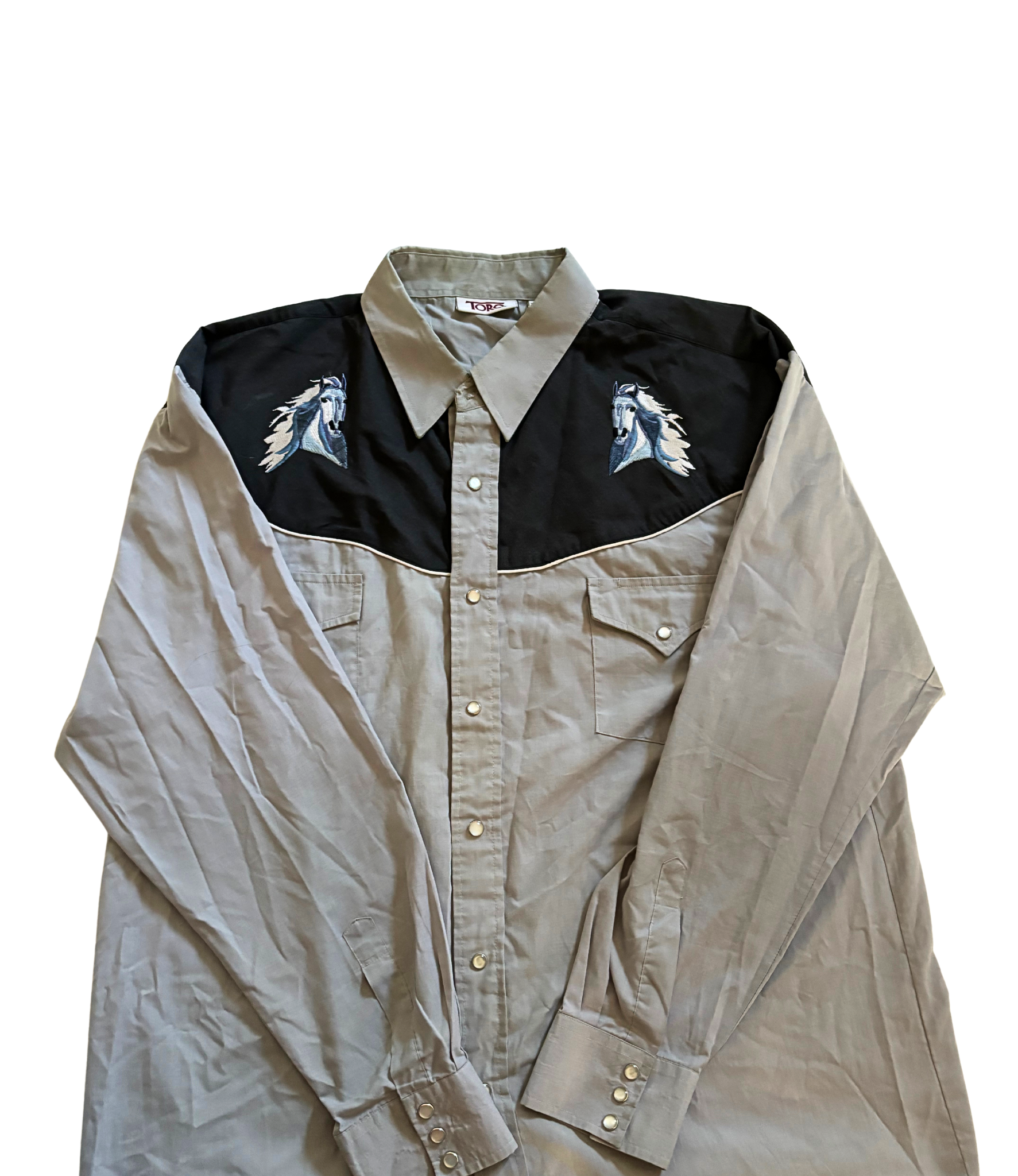 This Mustang Pearl Snap shirt features exquisite embroidered horse detailing and elegant grey border piping, combining classic Western style with refined craftsmanship. Designed in a versatile men's XL or women's XXL fit, it offers a like-new quality that ensures both comfort and durability. Perfect for those who appreciate sophisticated, timeless apparel with a distinctive touch.