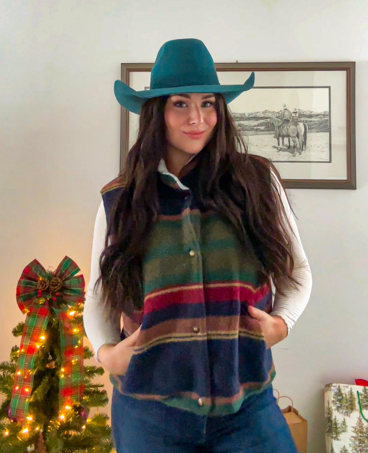 A cozy, thick fleece vest in rich western-inspired stripes, made for crisp winter days and Cowboy Christmas nights. Warm, size-forgiving, and easy to layer, this piece brings classic western charm with a festive feel — perfect for holiday markets, family gatherings, and fireside evenings.
