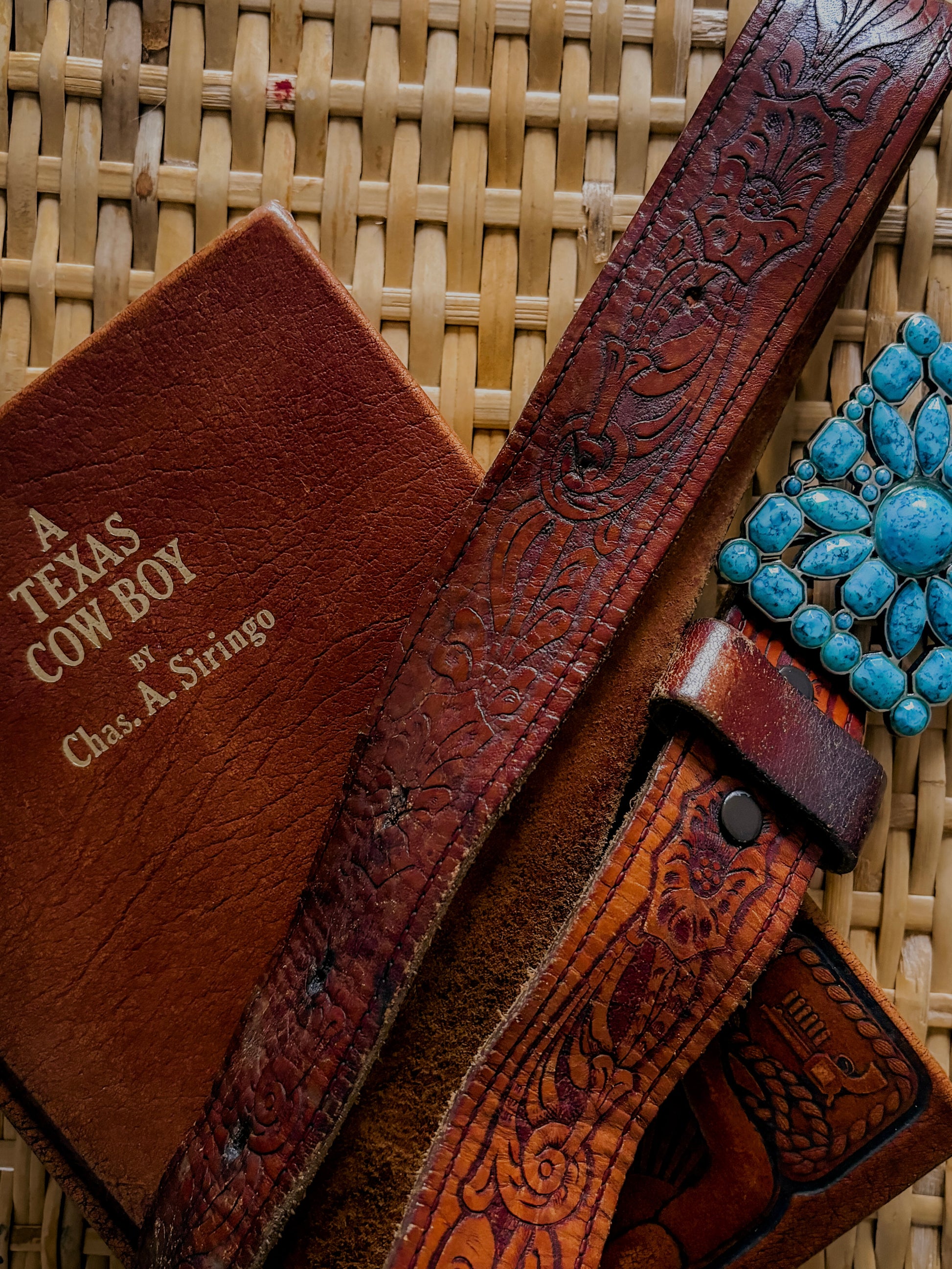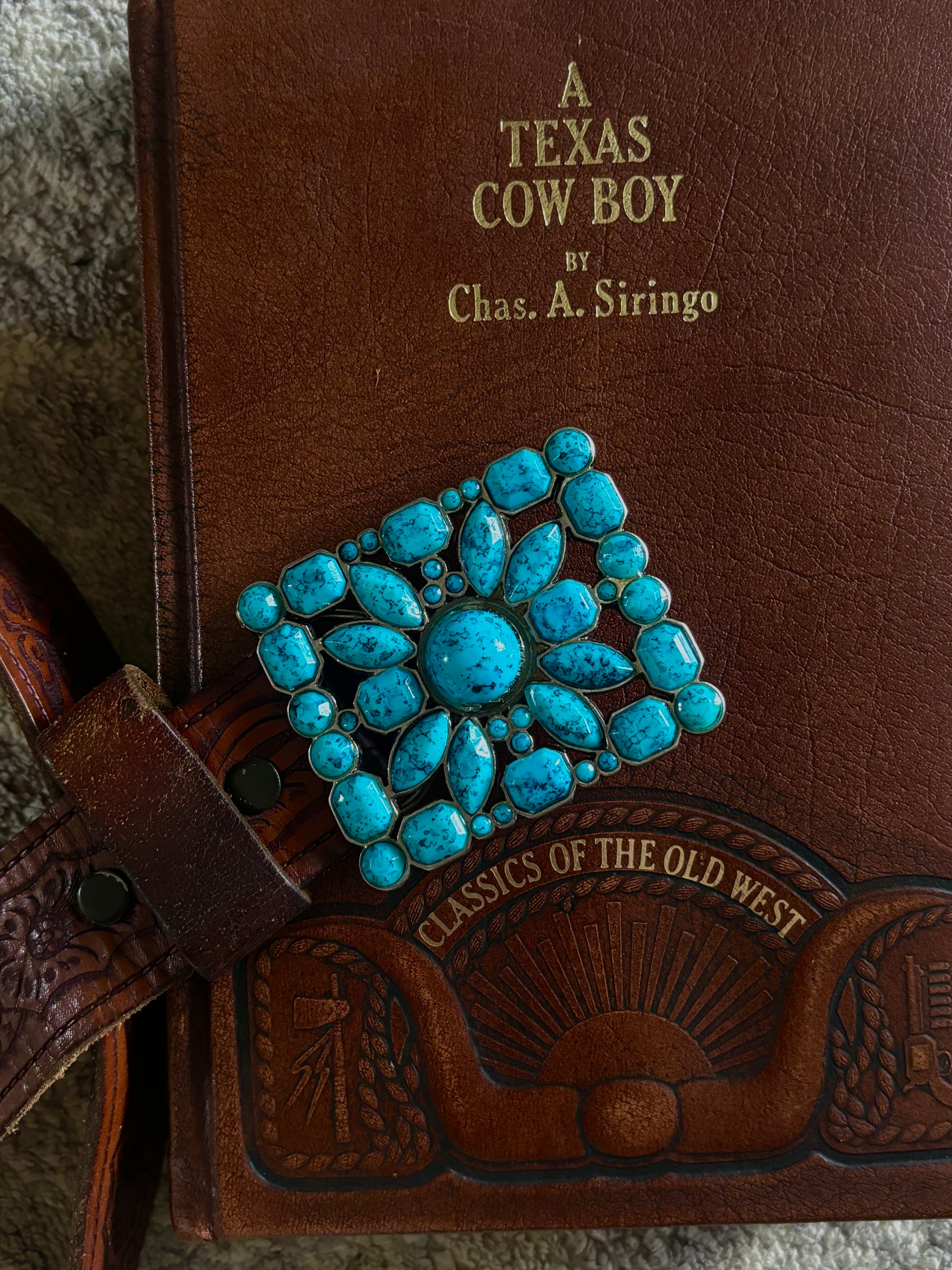 - Square Turquoise Belt Buckle with a vintage leather belt.