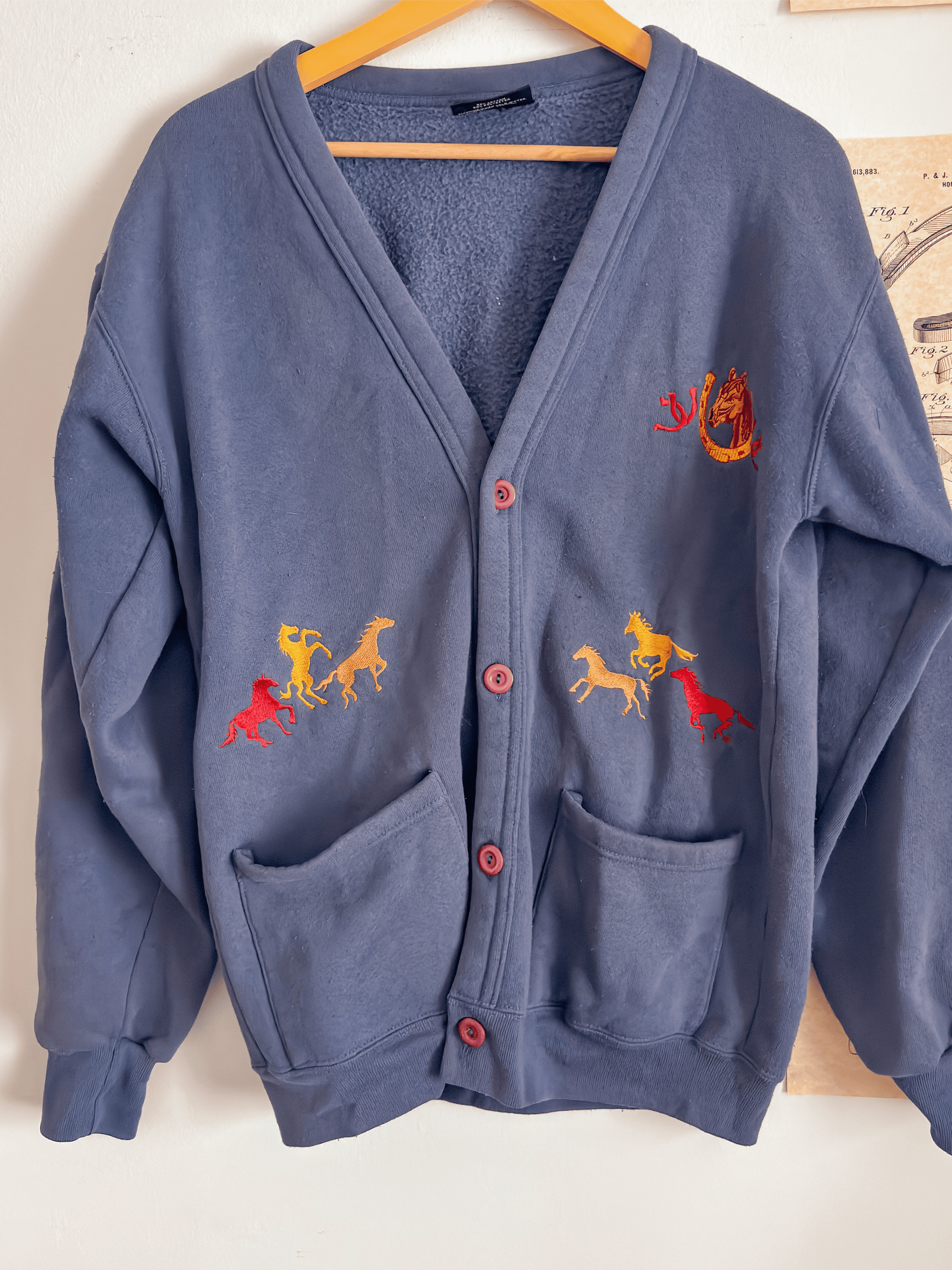 Cozy up in this Wild Horses Fleece Cardigan. Soft navy fleece with an embroidered horse and horseshoe design gives you that vintage charm you're looking for. The oversized fit hits at the waist for comfortable, easy wear, and red buttons add a nice touch. Perfect for layering or wearing on its own.